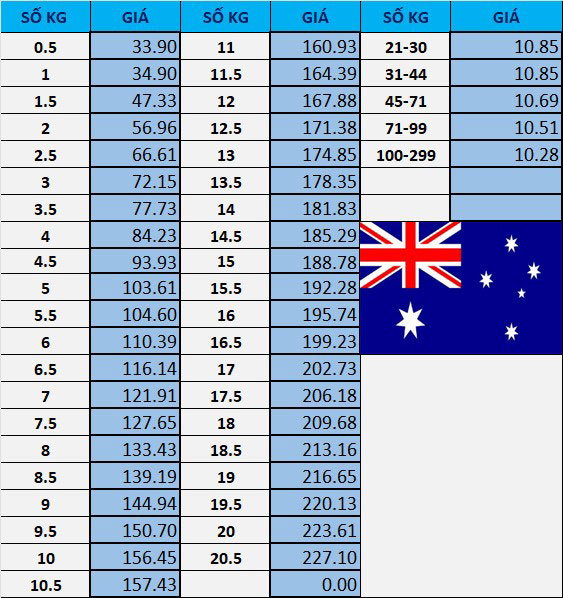 Tùy thuộc chủng loại hàng gửi, kích cỡ, khối lượng, thể tích, số lượng cần vận chuyển, mức giá sẽ khác nhau. Ngoài giá cước theo kg hoặc theo thể tích, Anh/chị cần phải biết thêm về các loại phí dịch vụ khác như thuế, bảo hiểm, giao hàng tận nơi,... Tham khảo bảng giá cước bên dưới để ước lượng chi phí gửi hàng sang Úc.